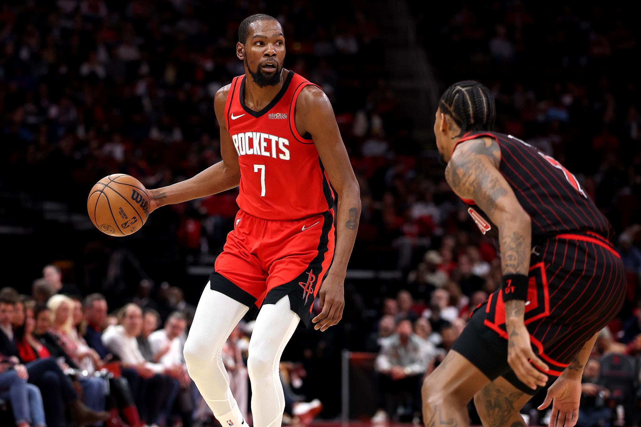 近半个月火箭队困境之中,杜兰特一直扮演着定海神针角色,过去6场比赛他场均砍下29.7分7.5板4.2助,投篮命中率51.5%。